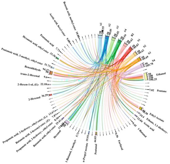 In Figure 4, ethanol was present in all the Japanese apricot fruit, the 42%vol base wine (B1), and the steeped mume wine (F1–F4), although the amount of ethanol in the fruit was much smaller than in the 42%vol base wine and the steeped mume wine. Hexanal was present in large quantities in the fruit during the developmental period, and its levels decreased and then increased. Benzaldehyde was the most abundant constituent in F1–F4, and ethyl acetate was much more abundant than in the fruit. Figure 5 shows more aroma components than Figure 4, and the number of lines in the figure is also higher, indicating that more aroma components can be produced with 65%vol base wine. The cases of ethanol, hexanal, benzaldehyde, and ethyl acetate in the graph were consistent with the above, with the difference that there are significantly more ethyl esters in S1–S4 than in F1–F4, mainly 1-hexanoic acid, butyl ester, butanoic acid, 3-hexenyl ester, (Z)-, pentanoic acid, 3-methyl-, ethyl ester, and so on.