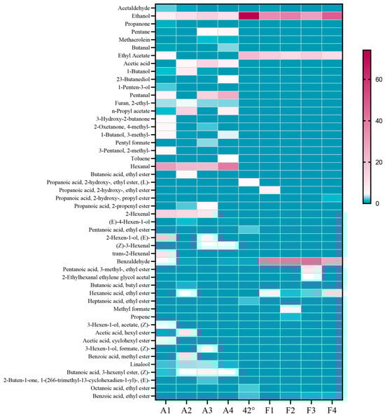 Heat map of aroma composition in Japanese apricot fruit (A1–A4), 42%vol base wine, and steeped mume wine made from 42%vol base wine (F1–F4).