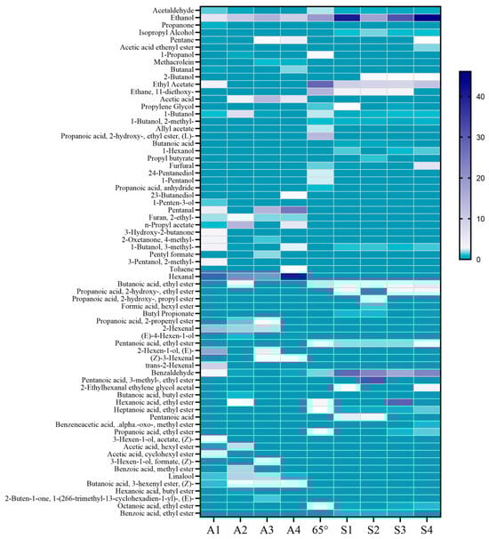 Heat map of aroma composition in Japanese apricot fruit (A1–A4), 65%vol base wine, and steeped mume wine made from 65%vol base wine (S1–S4).