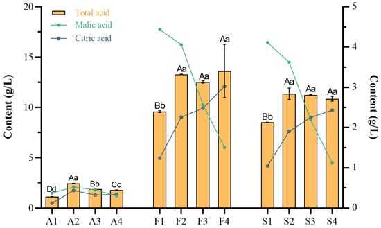 Content of organic acid in Japanese apricot fruit and steeped mume wine. Note: the amount of organic acid in Japanese apricot fruit (A1–A4), in steeped mume wine made from 42%vol base wine (F1–F4), and in steeped mume wine made from 65%vol base wine (S1–S4). Different small and capital letters indicate significant difference (p < 0.05) and extremely significant difference (p < 0.01) respectively.