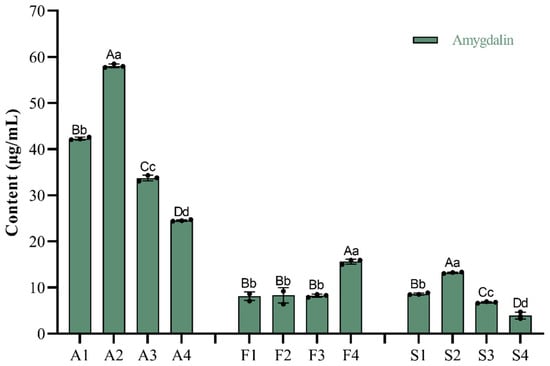 As shown in Figure 9, the amygdalin content within the fruit at the A2 stage reached a peak value of 58.05 μg/mL. After that, with the increase in fruit maturity, the amygdalin content decreased, and at A4, it had the minimum value of 24.56 μg/mL. Within the steeped mume wine, the amygdalin content from F1 to F3 did not change significantly, and the content at F4 increased significantly to 20.97 μg/mL. The trend of S1 to S4 was more similar to that of A1 to A4, and S2 appeared to have the maximum value of 13.22 μg/mL (See annexed Table S6 for more data).