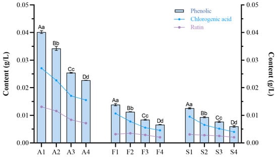 Chlorogenic acid and rutin belong to polyphenols. As can be seen in Figure 10, the content of phenolics in the fruit and steeped mume wine decreased significantly at all times as the fruit matured. At the A1 period, the chlorogenic acid content was 0.0271 g/L, and the content of rutin was 0.0128 g/L, with chlorogenic acid being almost twice as high as rutin. By A4, the chlorogenic acid content was only 0.0155 g/L, and the rutin content was only 0.0070 g/L. Chlorogenic acid content decreased more rapidly than rutin, by 0.0611 g/L and 0.0610 g/L from F1 to F4 and S1 to S4, respectively, while rutin decreased by 0.0113 g/L and 0.0098 g/L, respectively (See annexed Table S7 for more data).
