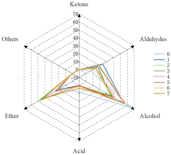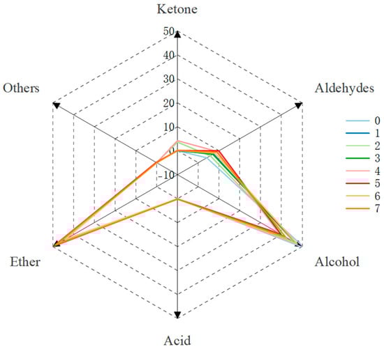 As shown in Figure 11, compared with the control group, microwave aging can significantly increase the contents of esters and aldehydes in fruit wines and reduce the contents of acids. Comparing groups 0, 1, 2, and 3, the low temperature of 40 °C can better promote the generation of aldehydes, and the total amount of esters and aldehydes is the most at 45 °C and 50 °C. Comparing groups 0, 2, 4, and 5, it can be seen that the treatment time has a great influence on the generation of esters: with the increase of the treatment time, the content of esters firstly increases and then decreases, and the content is the highest when the treatment time reaches 80 min. Comparing groups 0, 2, 6, and 7, the power conditions also had a great influence on the catalytic effect, with either too high or too low power affecting the generation of esters, and only when the power was 500 W, the acids in the fruit wines could be eliminated most effectively (Table 1).