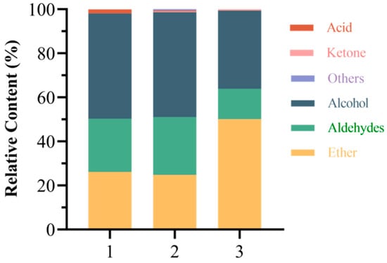 Comparison of the relative contents of aroma components between new wine and steeped mume wine after different aging methods. Note: 1, 2, and 3 indicate the wine of the year, the wine naturally aged for 10 years, and the wine after microwave aging, respectively.