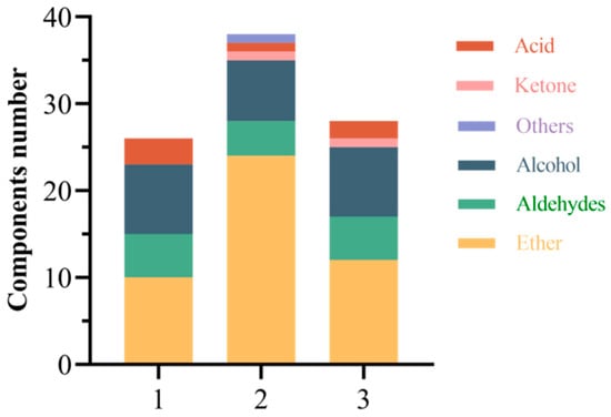 Comparison of the number of aroma components between new wine and steeped mume wine after different aging methods. Note: 1, 2, and 3 indicate the wine of the year, the wine naturally aged for 10 years, and the wine after microwave aging, respectively.