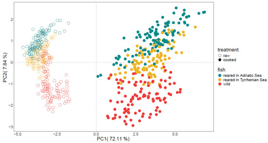 A total of 227 mass peaks were identified that significantly differentiated between the raw and cooked sea bream samples. The plots of all mass peaks are listed in Supplementary Figure S1. After cooking, 64% of the total mass peaks increased significantly in concentration. Raw fresh fish is known to have a very mild aroma, which intensifies after thermal degradation, in which the aroma profile is highly dependent on the fish species and cooking procedure [9,16]. The score plot in Figure 1 and loading plot (Supplementary Figure S2) illustrate this distinct separation between the cooked and raw fish samples from both wild and reared fish (originating from the Adriatic and Tyrrhenian Seas) using principal component analysis (PCA). The cooked fish samples are positioned on the positive side of PC1, while the raw fish samples are on the negative side of PC1, with an explained variance of 79.95% through PC1 and PC2.