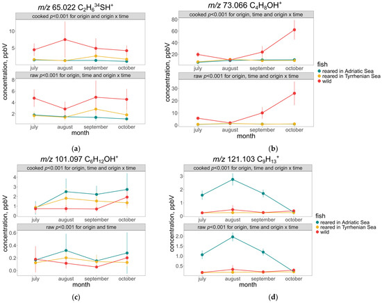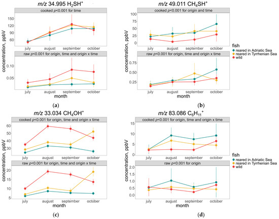 Figure 2a illustrates the differences in t.i. hydrogen sulphide concentration before and after cooking, which is in agreement with previous studies of the formation of this compound during amino acid and protein degradation for other fish species, like salmon [17] and tuna [18,19]. Moreover, despite the low concentration in the raw samples, the two-way ANOVA showed significant differences (p < 0.001) in time, origin, and their interaction between fish samples of different origin. In the cooked samples, the differences in origin were less evident, but the same increasing trend in time for the first three months, with the slight decrease in October, was observed, as well as in raw samples. Other compounds that showed similar behaviour include t.i. methanethiol (Figure 2b) and methanol (Figure 2c). Interestingly, although similar in trends, the scale is vastly different between raw and cooked fish, indicating a large increase in these compounds due to the cooking process.