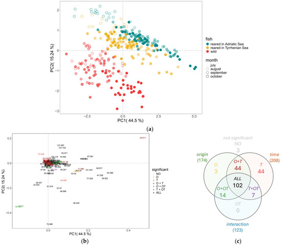 In Figure 3c, a Venn diagram summarizes the results obtained from the two-way ANOVA performed based on two independent variables: the geographical origins of the seabream (O) and the time of harvest by month (T), along with their interaction (OT). The interactions between O and T represent a combined effect between how geographical origin and time of harvest may affect changes in VOC concentration. The results highlight how geographical origin and time of harvest each independently affect certain VOCs in cooked fish, while other VOCs are influenced by both factors (interaction effect). As shown in the Venn diagram (Figure 3c), 3 mass peaks differed only by origin (O), 44 mass peaks only by time (T), 44 mass peaks by both origin and time (O + T), 14 mass peaks by origin and its interaction with time (O + OT), 7 mass peaks by time and its interaction with origin (T + OT), and 102 mass peaks by origin, time, and their interaction (ALL).
