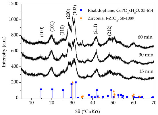 Diffraction lines of tetragonal zirconia, t-ZrO2, ICDD PDF No. 50-0189, are clearly visible on the pattern of the sample whose synthesis lasted for 60 min. These lines are weaker on the pattern of the sample whose synthesis took 30 min and imperceptible on the pattern of the sample whose synthesis took 15 min. It is obvious that a shorter synthesis time avoids excessive wear of the vessel and balls, as well as the contamination of the sample with ZrO2. On the other hand, there are no peaks characteristic for reactants in any of the patterns and the intensities of the rhabdophane peaks do not differ significantly, so it can be assumed that the reaction is complete. Therefore, only the sample whose synthesis lasted 15 min was further investigated, since the contamination and wear of the vessel and balls were negligible.