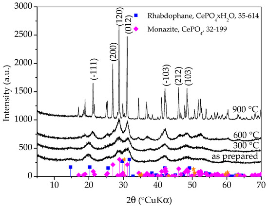 From Figure 5, it can be observed that the diffraction patterns of as-prepared sample and sample heated to 300 °C are quite similar and it is safe to say that the sample heated to 300 °C is still composed dominantly of rhabdophane. In the diffraction pattern of sample heated to 600 °C, the transformation of rhabdophane into monazite is clearly visible. The diffraction peaks are still very broad and the change does not seem dramatic at first glance, but a careful look at the pattern will make it clear that the transformation of rhabdophane into monazite is complete at 600 °C. Thermal treatment to 900 °C caused the growth of monazite crystallites, which is evident from the distinct narrowing of the diffraction maxima, suggesting an increase in monazite crystallite size. It is possible that a zirconia (011) peak (at 30.25 °2θ) emerged in the XRD pattern of the sample heated to this temperature. However, at the same angle, the (−211) peak of monazite should appear. Other zirconia peaks have lower intensities and also overlap with monazite peaks. From the obtained results, it can be concluded that the prepared rhabdophane is quite thermally stable but, despite the literature sources, the phase transformation of rhabdophane into monazite occurs at a temperature below 600 °C. Based on this analysis, a weak exothermic peak appearing on the DTA curve around 600 °C could be attributed to the transformation of rhabdophane to monazite.
