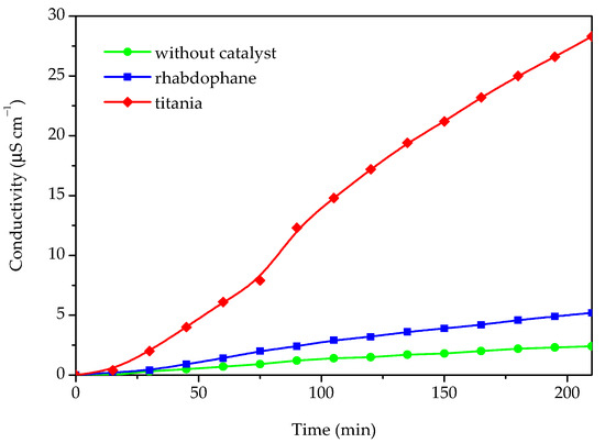 The photocatalytic activity was determined by measuring the conductivity of the water containing the volatile degradation products of the Castor oil degradation process. For the purpose of comparison, the same experiment was accomplished in the presence of commercial titania and without any catalyst. The results of the photocatalytic degradation experiments, i.e., conductivity as a function of time, are presented in Figure 9. As can be seen from Figure 9, some catalytic activity of the investigated sample could be observed because the conductivity in the presence of the investigated sample is roughly twice as high as without any catalyst. However, in comparison with titania, which has a significantly higher activity, the photocatalytic activity of the prepared material could be rated as very weak. Based on the conducted photocatalytic experiment, it can be concluded that the investigated material could be suitable for use as a UV filter in sunscreens since it behaves as a nonoxidizing agent and does not impair sunscreen photostability.