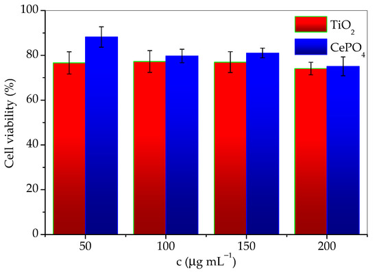 The results of cytotoxicity investigation of the prepared sample and commercial titania, expressed as the percentage of surviving cells depending on the concentration are given in Table 1. The data are also given in Figure 10 for easier comparison. According to the guidelines for the determination of in vitro cytotoxicity of medicinal products, a material is considered nontoxic if cell survival is ≥70% after treatment. From the tabular data of the obtained results, it can be seen that the cells tolerated the treatment of both agents well, and the survival percentage was satisfied by both materials. It can be concluded that both TiO2 and CePO4 are noncytotoxic and suitable for use in skin products. However, although the differences in values are small, it should be emphasized that cell survival was greater in the presence of the investigated phosphate sample. This difference was especially notable for the lowest concentrations. It should be noted that cell viability decreases slightly faster with concentration in the presence of CePO4 than TiO2. Therefore, conducting the cytotoxicity research in a wider concentrations range would be advisable.