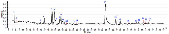 Phytochemical profiling and the respective correlations between metabolic profiles in watercress leaves under different cultivation conditions were determined using chemometrics on data retrieved from m/z features and the total ion chromatogram decomposition under binning, which were used to build a combined data matrix. Hence, 23 influential signals for classifying and differentiating sample groups (variable important of the projection (VIP) > 1) were recognized from a totalized chromatogram (7 min to 50 min), represented by the corresponding loadings line obtained through principal component analysis (PCA). This analysis was performed using Pareto-scaled data without centering, with the Pareto variance applied as the base weight type (Figure 1). The influential signals were distributed among watercress samples collected after propagation in hydroponic cultivation system (HCS), aquaponic cultivation system (ACS), and traditional outdoor cultivation (TOC), as well as between two harvest times such as ‘baby leaf’ (t1 = 21 days after transplantation, DAT) and traditional harvest (t2 = 42 DAT). Under this design, the analysis included 72 samples and 3937 variables (metabolite-related features).