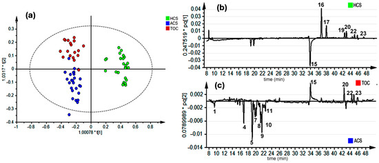 (a) Orthogonal partial least squares regression analysis (OPLS-DA)-derived score-plot for individual watercress leaf samples, supervised by cultivation system, i.e., hydroponic cultivation system (HCS), aquaponic cultivation system (ACS), and traditional outdoor cultivation (TOC). The data set was autoscaled using unit variance (UV); Principal Component 1 (PC1) vs. PC2 (t[1] × t[2], R2Xcum = 0.83, Q2Xcum = 0.72). (b) Loadings line obtained after combination of X loading weight p and Y loading weight q to one vector (pq[1]) obtained from PLS-DA along t[1]. (c) Loadings line (pq[2]) along t[2]. * represents multiplication of vector t with a constant depending on the X data distribution.