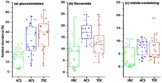 Box plots represent the distribution of the relative abundance of specialized metabolites: (a) glucosinolates; (b) flavonoids; and (c) indole phytoalexin.