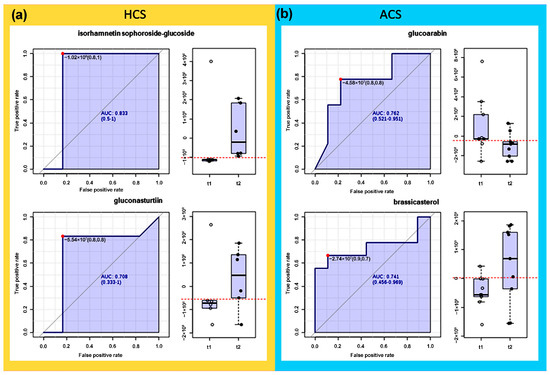 The most differential metabolites per cultivation system between harvest times t1 vs. t2 on the LC–MS-derived metabolite profile data from watercress leaves collected from (a) hydroponic cultivation system (HCS) and (b) aquaponic cultivation system (ACS). Each two-chart panel per cultivation system and differential metabolite comprises the receiver operating characteristic (ROC) curve (left) and the box plot showing the normalized levels per harvest time (right). Area under curve AUC > 0.70 as choice criteria; gluconasturtiin (AUC = 0.833), isorhamnetin sophoroside–glucoside (AUC = 0.708), glucoarabin (AUC = 0.762), and brassicasterol (10) (AUC = 0.741).
