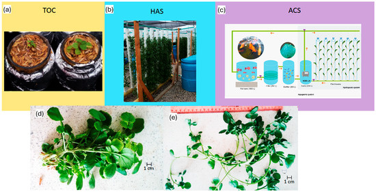(a) Traditional outdoor culture (TOC); (b) hydroponic cultivation system (HAS); (c) aquaponic cultivation system (modified from a previous design [34]; (d) first harvest time (t1) or ‘baby leaf’; and (e) second harvest time (t2) or traditional harvest.