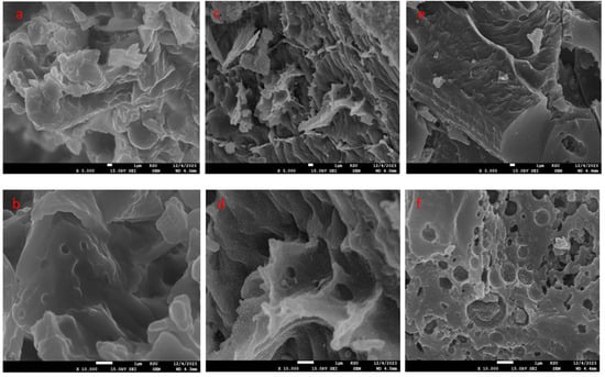 SEM analysis of BS (a,b), BS-AAC (c,d), and BS-BAC (e,f) magnified 3000 and 10,000.