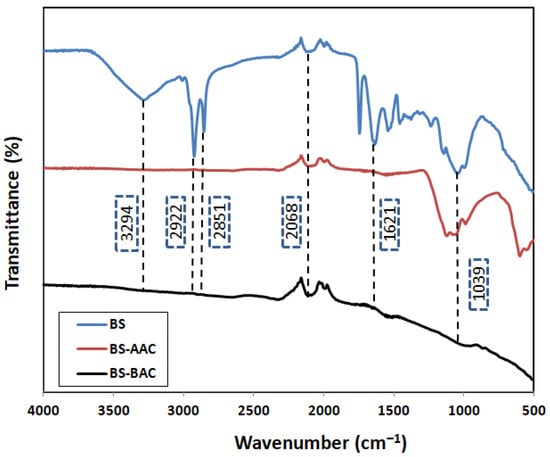 FTIR spectra of BS, BS-AAC, and BS-BAC.