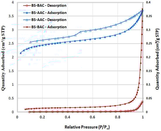 BS, BS-AAC, and BS-BAC hysteresis loops are shown in Figure 3. As classified by IUPAC, BS-BAC exhibited hysteresis loops H3 and H4, which indicates a macroporous and mesoporous structure []. By contrast, BS-AAC exhibited type IV isotherms with an H3 hysteresis loop, which is typical of mesoporous and microporous materials. Indeed, the size of the mesopores grows and additional micropores form as the pyrolysis temperature rises above 550 °C []. A BET analysis also revealed that BS-BAC had low surface areas (11.27 m2/g) and that BS-AAC had the largest surface area (174.4 m2/g) (Table 2). The high mesoporous content in BS-AAC suggests that the treatment process is appropriate, as it offers many active sites for the breakdown of contaminants.
