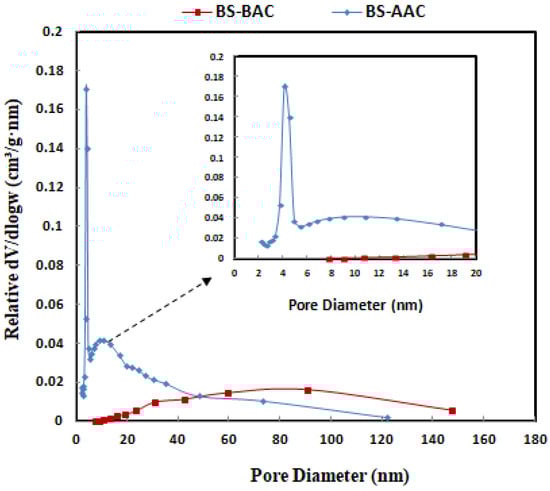 The pore size distribution of the BS-AAC and BS-BAC samples is presented in Figure 4. The pore size distributions of these adsorbents were calculated from the N2 adsorption isotherm following the Barrett–Joyner–Halenda (BJH) method with calibration. As shown in Figure 4, the distribution of the pore sizes of the BS-AAC and BS-BAC samples can be seen. There was a relatively broad pore distribution in both the BS and BS-BAC samples. On the other hand, the pore distribution for the BS-AAC sample shifted into mesopores with a center at 4 and 2.7 nm.