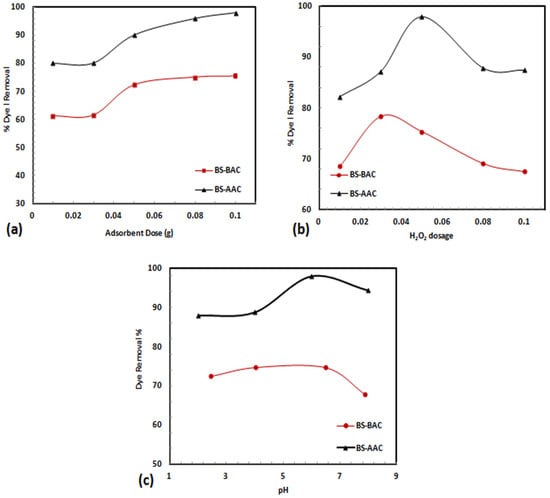 (a) Activated carbon dose effect (pH = 6.5, C0 = 10 mg/L, 0.05 M H2O2), (b) H2O2 dose effect (activated carbon dosage = 0.1 g, pH = 6.5, and C0 = 10 mg/L), and (c) pH effect (activated carbon dosage = 0.1 g, 0.05 M H2O2 (BS-AAC) and 0.03 M H2O2 (BS-BAC), and C0 = 10 mg/L).
