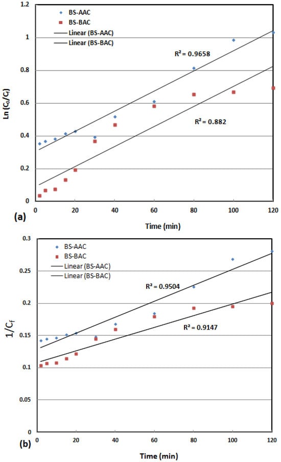 where t represents the time (min). The constants for the pseudo-first- and pseudo-second-order models are denoted by k1 and k2, respectively. For BS-AAC and BS-BAC, the first-order R2 is 0.966 and 0.882, respectively (Figure 7a). For the second order, the R2 for BS-AAC and BS-BAC is 0.950 and 0.915, respectively (Figure 7b), indicating that, for BS-AAC, the oxidation of MG dye is best described by the first-order kinetic model, while for BS-BAC, the second-order kinetic model is the most appropriate.