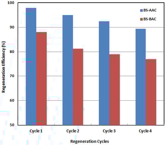 Chemical regeneration eliminates pollutants from the activated carbon’s surface without causing carbon attrition by using certain chemicals [,]. The potential of this method is dependent on how soluble and reactive the pollutants are with the chemical reagents, which are used to dissolve pollutants using acid and base reagents []. After pollutants have been eliminated from the AC’s surface, the reagents must be eliminated in order to recover the regenerated AC [,]. To test activated carbons’ reusability, ACs loaded with dye were initially desorbed using 0.1 M NaOH. After that, distilled water and 0.1 M HCl were used to wash the air conditioners until the pH was about 7.0. AC regeneration and reuse studies were performed for the fourth cycles (Figure 8). Malachite green elimination was found to be above 89% for AC-AAC and 77% for AC-BAC, even after four regeneration cycles. The degradation efficiency of malachite green (MG) after four cycles is likely due to factors related to adsorption and oxidation processes. Adsorption-related issues include the loss of active sites, changes in porosity, and incomplete regeneration. Oxidation-related issues involve deactivation, oxidant depletion, and byproduct formation []. To improve the reusability of activated carbon, careful optimization of the regeneration process and an understanding of degradation mechanisms are crucial. Characterizing the activated carbon before and after each cycle can help identify the dominant factors contributing to the loss of efficiency.