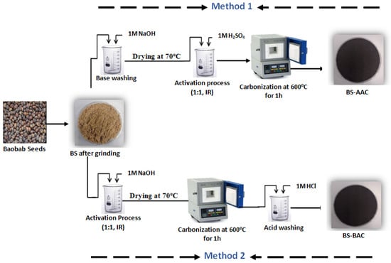 For acid activation, the ground baobab seeds (BSs) were refluxed with 1 M NaOH solution for 1 h to reduce ash content in the sample. After the basic solution was drained, the baobab seeds were washed with distilled water and dried at 70 °C for 24 h. Subsequently, the baobab seeds were impregnated with 1 M H2SO4 at impregnation ratio (1/1, mass ratio of activating agent to dried baobab seeds). Then, the mixture was heated in a furnace with the absence of oxygen at 600 °C for 1 h. The selected temperature 600 °C was part of the input series applied to assess the best condition for the production of activated carbon from biomass per the literature [,]. The developed AC was named BS-AAC (Figure 10).
