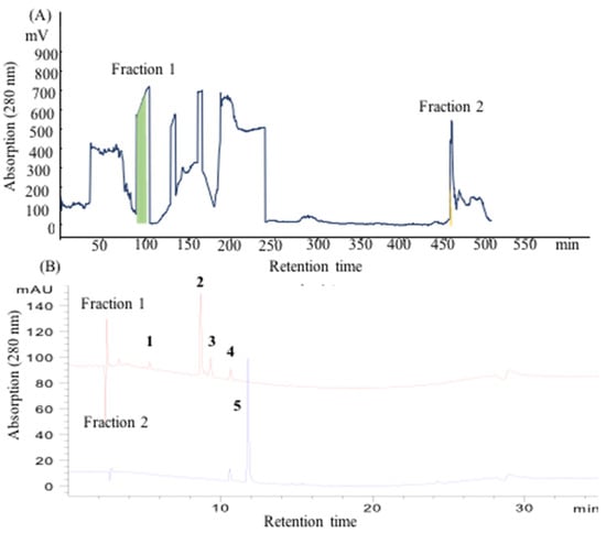 (A) CCC profile using the 18% PEG-1000/15% (NH4)2SO4 solvent system. The upper phase is the stationary phase, while the lower phase is the mobile phase. Rotation speed: 1100 rpm, flow rate: 2 mL/min, Sf: 36.9%. (B) HPLC analysis of the fractions. The components numbered 1 to 5 represent the five primary elements identified in the extract.
