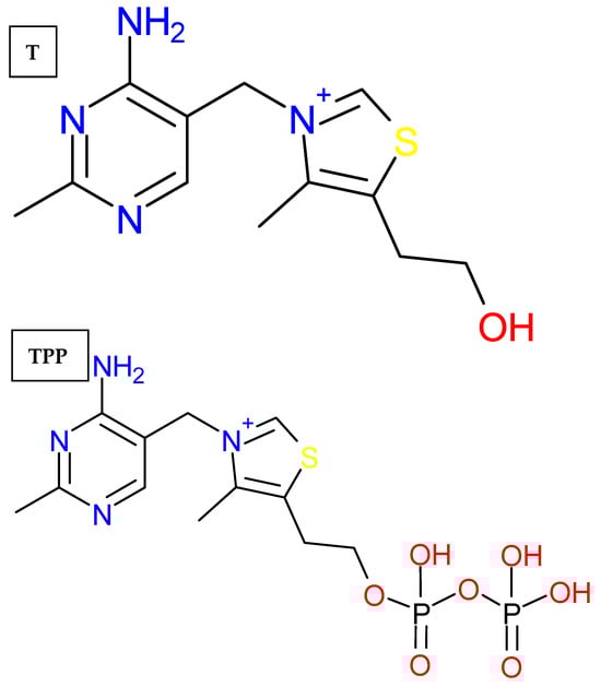 Free thiamine (T) occurs mainly in the plant world, while in animal tissues, it usually exists in the form of diphosphothiamine (pyrophosphate, TPP). Particularly, in the human body, thiamine occurs in three forms: monophosphate (thiamine phosphate, TMP), diphosphate (thiamine diphosphate, TDP) or pyrophosphate (thiamine pyrophosphate, TPP) and triphosphate (thiamine triphosphate, TTP) [,,,]. In the extracellular space, thiamine occurs as T and TMP; however, in the cytosol of the cell it occurs mostly in the form of phosphate esters. Thiamine is transported across the cell membrane in the form of TMP []. In commercial products, such as drugs and dietary supplements, thiamine occurs most commonly as hydrochloride, mononitrate or diphosphate [,,].