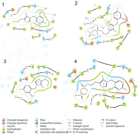 The molecular dynamics simulations enabled the study of the interactions between the ligands and proteins that are responsible the stability of those complexes. It has been shown that π-π interactions and hydrogen-bond interactions with the nitrogen atoms in the aromatic rings of thiamine are the main factors stabilizing the formed complexes. For simulation 3, conducted for the T bonded with AchE in the non-competitive mode, their fundamental role in stabilizing the complex is shown in the π-π interaction of TRP86 and the hydrogen bonds formed by amino acids such as TRP 86, SER203, and TYR337 with the heterocyclic rings of the ligand, as well as the ASN87 interacting with the hydroxyl group of the ethanolic moiety of T. For simulation 4, performed for TPP, the complex is stabilized by the π–π interactions with TRP86, and the hydrogen-bond interactions with TYR72, ASP74, and SER125. Additionally, the presence of a polar pyrophosphorous group allows for the formation of numerous hydrogen bonds with amino acids such as GLU202, TYR 337, HIS 447, and SER 203. These bonds were often transferred by water molecules, forming water bridges.