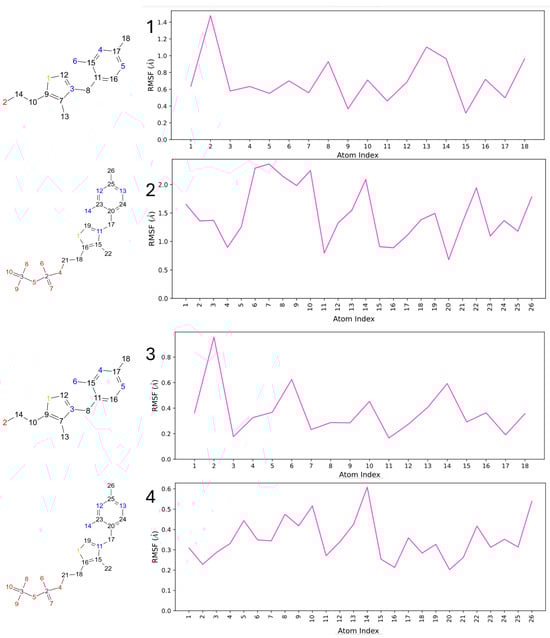RMSF values obtained from the MD simulations. Black numbers represent carbon atoms, blue numbers represent nitrogen atoms, red numbers represent oxygen atoms, yellow numbers represent sulfur atoms, brown numbers represent phosphorus atoms. Description of the models (1–4) is presented in Table 2.