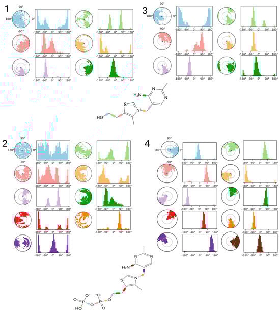 Distribution of the ligand’s torsion values, obtained from the MD simulations. Description of the models (1–4) is presented in Table 2. The colors used in the graphs represent the torsion angles indicated in the corresponding molecular structures, below the graphs.