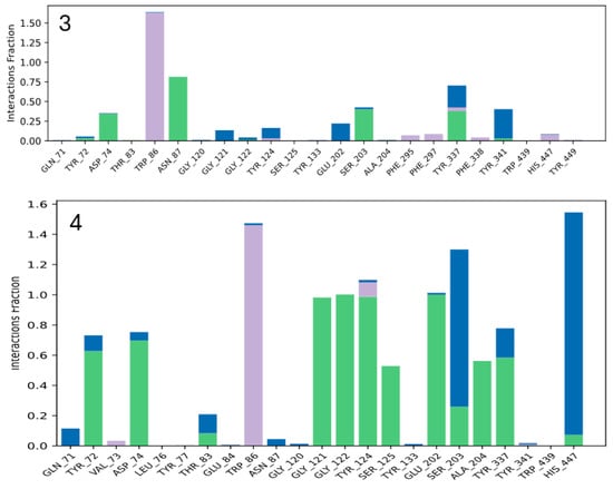 Interactions of ligands, T, and TPP, with AChE obtained from molecular docking. Description of the models (1–4) is presented in Table 2. The stacked bar charts are normalized over the course of the trajectory; for example, a value of 0.7 suggests that 70% of the simulation time for the specific interaction is maintained. Values over 1.0 are possible as some protein residue may make multiple contacts of same subtype with the ligand. Green color represents H-bonds, violet color represents hydrophobic interactions, pink color represents ionic interactions, blue color represents H-bonds through water bridges.