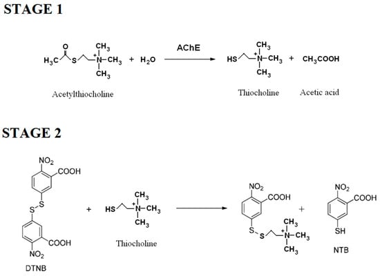 The free thiocholine (stage 1), formed from acetylthiocholine under the influence of AChE, reacts then with the DTNB releasing a certain amount of NTB (stage 2), the concentration of which depends on the AChE activity [].