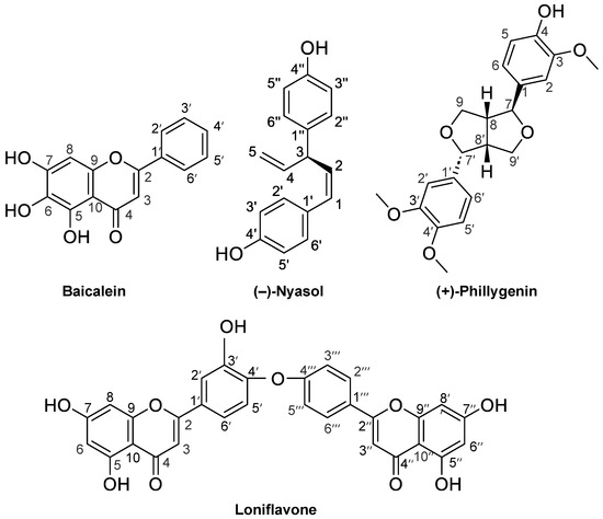 The chemical structures of the compounds purified in this study. Baicalein (Compound 1) from Scutellaria roots, (−)-nyasol (2) from Anemarrhena rhizomes, loniflavone (3) from Lonicera leaves and stems, and (+)-phillygenin (4) from Forsythia fruits.