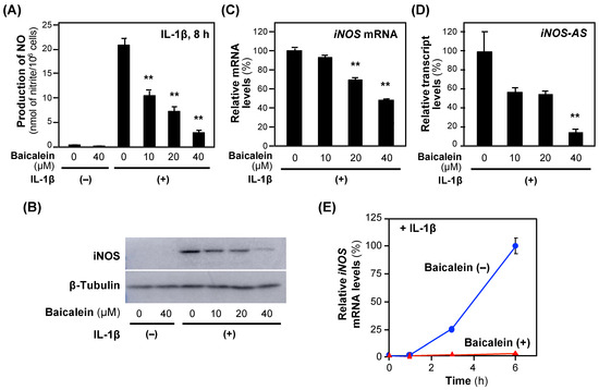Next, we investigated the iNOS gene expression. Baicalein reduced both iNOS protein and iNOS mRNA levels (Figure 3B,C), suggesting that the iNOS gene expression is regulated at a transcriptional step. Because a natural antisense transcript (iNOS-AS) transcribed from the iNOS gene interacts with and stabilizes iNOS mRNA [18], we analyzed the effects of baicalein on iNOS-AS expression. Baicalein inhibited iNOS-AS in a concentration-dependent manner (Figure 3D). The iNOS mRNA level increased in the presence of IL-1β, whereas it was inhibited by baicalein for 6 h after the addition of IL-1β (Figure 3E). Similarly to chlorogenic acid [9], baicalein inhibits the induction of the iNOS gene expression at both the transcriptional and post-transcriptional levels.