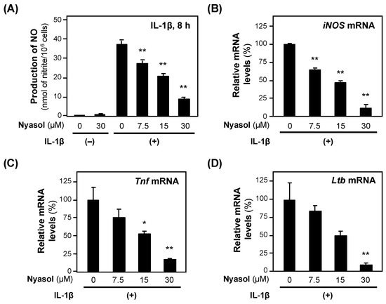 When (−)-nyasol was added to the medium of the rat hepatocytes together with IL-1β, the NO concentration decreased in a concentration-dependent manner without showing cytotoxicity, i.e., <5% of the activity of the whole-cell extract (Figure 4). The calculated IC50 value of (−)-nyasol for the suppression of NO production was 18.3 ± 2.99 μM. (−)-Nyasol significantly decreased the levels of iNOS mRNA. Furthermore, (−)-nyasol significantly reduced the levels of mRNAs encoded by proinflammatory genes, such as tumor necrosis factor α (Tnf) and lymphotoxin β (Ltb) mRNAs (Figure 4).