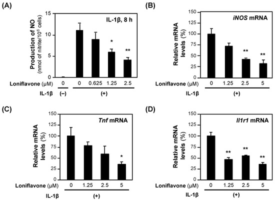 Next, we examined the effects of loniflavone on the expression of the mRNAs encoding proinflammatory genes. Loniflavone decreased the levels of iNOS and Tnf mRNAs in a concentration-dependent manner (Figure 5). IL-1β induces the expression of type 1 interleukin 1 receptor (IL1R1), which regulates the expression of proinflammatory genes, including the iNOS gene [22]. When we measured the Il1r1 mRNA levels, loniflavone significantly decreased the Il1r1 mRNA levels (Figure 5).