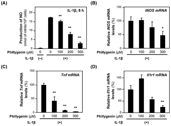 The effects of (+)-phillygenin on the expression of proinflammatory genes. (A) A decrease in NO production by (+)-phillygenin in hepatocytes. (+)-Phillygenin and IL-1β were added to the medium of primary-cultured rat hepatocytes and incubated for 8 h until the NO concentration was measured. Cytotoxicity was not observed at the concentrations applied. (B–D) mRNA levels in hepatocytes. After incubation with (+)-phillygenin and IL-1β, the total RNA was extracted. The level of each mRNA was measured by RT–qPCR and normalized to the Ef1a mRNA level. The relative mRNA levels (%) of iNOS mRNA (B), Tnf mRNA (C), and Il1r1 mRNA are presented as the means ± SDs (n = 3) when the mRNA level measured was set at 100% in the presence of IL-1β alone. * p < 0.05 and ** p < 0.01 versus IL-1β alone.