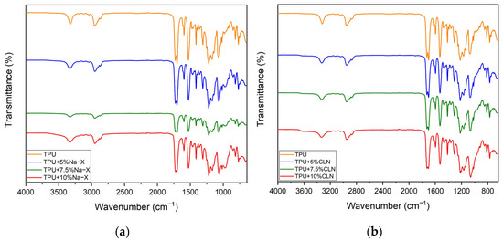 ATR spectra of (a) TPU + Na-X and (b) TPU + Clinoptilolite composites.