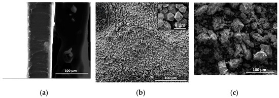 SEM images of zeolite Na-X, CLN and TPU, as well as of TPU+Na-X and TPU+CLN composites, are shown in Figure 2. The SEM micrograph of the TPU film shows a smooth surface morphology (Figure 2a). The Na-X zeolite had a regular octahedron-like shape and homogeneous grain size (Figure 2b), around 2.5 μm, due to its synthetic nature. On the other hand, CLN, being a milled tuff, showed a wide polydisperse grain size, along with a more irregular particle shape (Figure 2c), up to 280 μm.