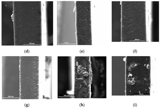 Morphological studies of the fractured surfaces of the composite films were carried out using an FEI Quanta 200 Field-Emission Gun (FEG) Scanning Electron Microscope (SEM) (FEI, Hillsboro, OR, USA) under vacuum with an accelerating voltage of 10–30 kV. Samples were put on an aluminum stab before undergoing a metallization process with an Au/Pd alloy via a sputtering operation (Emitech K575X) to make them suitable for this type of analysis.
