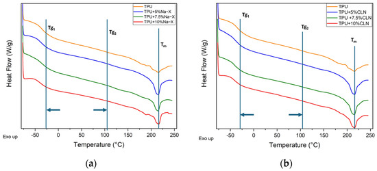 DSC curves for (a) TPU+Na-X and (b) TPU+CLN composites.