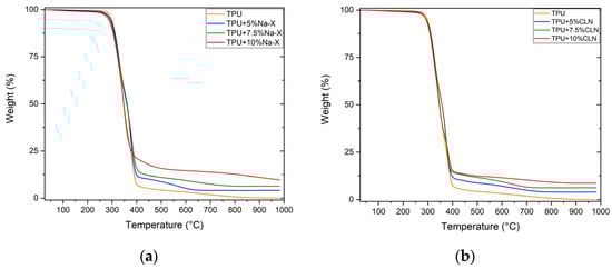 (a) TGA and curves of TPU + Na-X, (b) TGA curves of TPU + CLN composites.