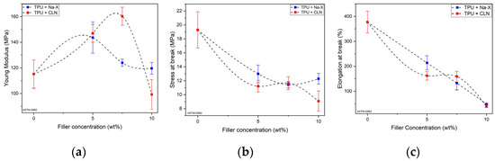 Young’s modulus (a), Stress at break (b) and Elongation at break (c) of the TPU + Na-X and TPU + CLN at different concentrations.
