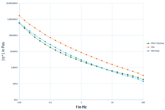 Complex viscosity |η*| vs. frequency at room temperature of TPU, TPU + 5% Na-X and TPU + 7.5% CLN. The trend lines have been added for each viscosity curve.
