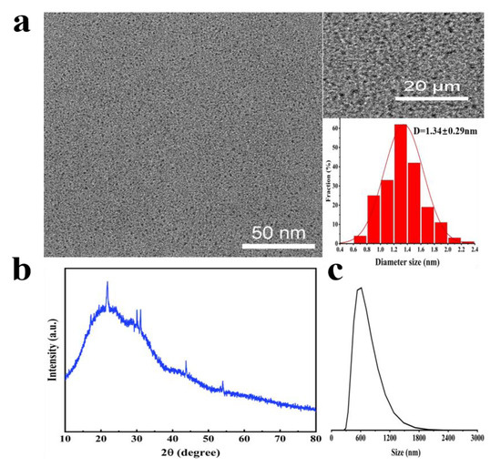 Figure 3. (a) TEM and HR-TEM images: the corresponding dot diameter distribution histogram from 200 NIR-CDs; (b) XRD pattern; (c) DLS analysis of NIR-CDs.