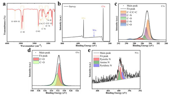 Figure 4. (a) FT-IR spectrum; (b) XPS survey spectra; (c) C1s XPS; (d) O1s XPS; and (e) N1s spectra of NIR-CDs.